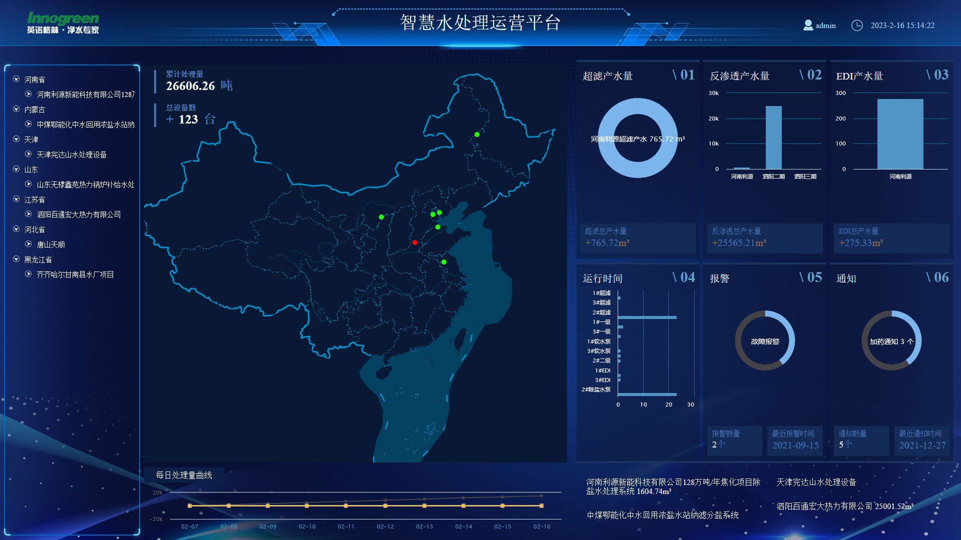 英諾格林云平臺通過物聯網模塊技術,將全國各地接入的項目設備運行數據和參數集成在云端數據中心平臺,實現運營數據實時監控、設備診斷、能耗分析、程序維護和故障報警等功能,同時集成設備的日常運營管理。英諾格林全國20多個滲濾液運營項目已實現遠程在線監控管理的智慧運營,也可以為客戶設備提供遠程監控和售后管理服務。英諾格林設備云平臺的上線,讓大型水處理設備運營項目智慧高效,運營成本大幅優化。